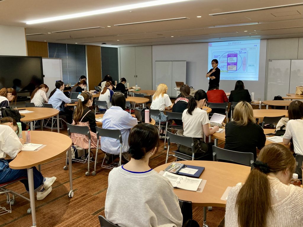 今日学んだのはプロジェクトの「スコープ」についてです。プロジェクトが取り組むべきことをどのように設定し、どのように整理すればよいのかについて、受講生それぞれが考えた”My Project”をベースに考えていきました。武庫女での心理学の学びと、それを実用的に使うためのさまざまな学びを組み合わせて、学生それぞれのキャリアを切り開いていってほしいと思っています。 (文責: 尾崎)
