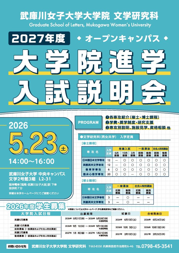 武庫川女子大学大学院文学研究科 2027年度大学院進学入試説明会 お知らせ 2026.04.28 大学院文学研究科の大学院進学入試説明会(オープン・キャンパス)が開催されます。臨床心理学専攻も参加しますので、進学を検討されている方はどうぞご参加ください。 開催日時:2026年5月23日(土)14:00~16:00(15:00受付終了)会場:中央キャンパス 文学2号館3階 L2-31教室内容:プログラム 14:00~各専攻紹介(修士・博士課程) 14:40~学費・奨学制度・研究支援の説明 15:00~専攻別説明※事前予約不要